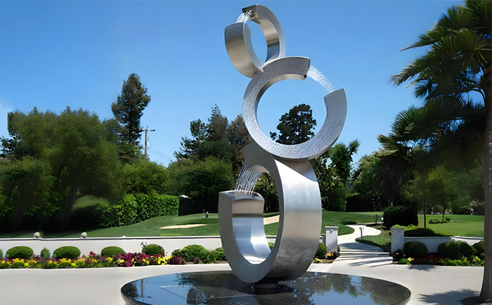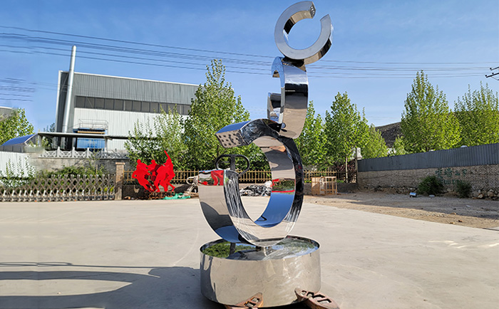 不銹鋼材質(zhì)賦予了雕塑現(xiàn)代感與時尚氣息,其光滑的表面能完美地反射周圍的環(huán)境與光影,當噴泉開啟,水流與光影相互交織,在不同的時段、不同的天氣條件下,呈現(xiàn)出千變?nèi)f化的視覺效果。白天,陽光灑在水面與雕塑上,閃耀著金色的光芒;夜晚,配合精心設(shè)計的燈光,噴泉雕塑又成為夜空中最璀璨的存在,為城市的夜景增添了一份浪漫與神秘。